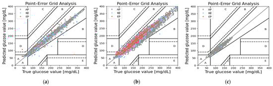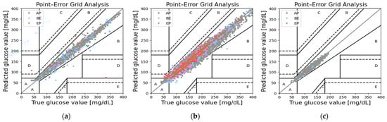 Table 3 shows information from the analysis of the Continuous Glucose–Error Grid Analysis (CG-EGA) graphs of all models when validated on the three test sets. Figure 5, Figure 6 and Figure 7 present the EGA plots for the models applied to the three datasets. The graphics are divided into A, B, C, D and E regions, represented by the solid lines. The dashed lines represent the expansion of the limits in zones A, B, and D, if the rate of true glucose level is 1 to 2 mg/dL.min.