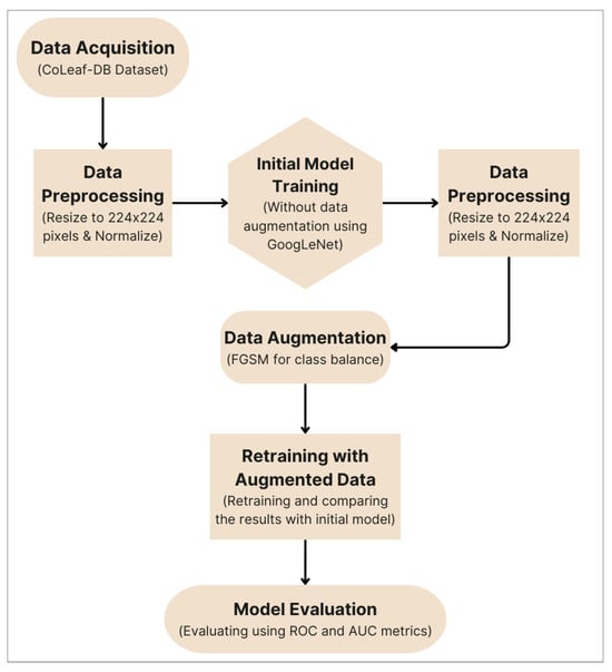 As a form of validation, we first trained the convolutional neural network (CNN) without data augmentation as presented in the original Coleaf-DB dataset. Subsequently, we performed data augmentation for each class using a modified FSGM method based on the Phosphorus class. Finally, with the classes regularized, the model is retrained and compared with the initial model without data augmentation. This entire sequence is illustrated in Figure 2.