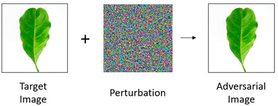 where is the model parameter, is the loss gradient, and is the noise magnitude applied to the input images. In this way, a new sample containing the input image plus an adversarial attack is produced as described in Figure 3. The generated sample is recognizable as a valid data sample representative of the unbalanced class, so it can improve the model’s classification accuracy by increasing convergence by increasing the data provided in the input.