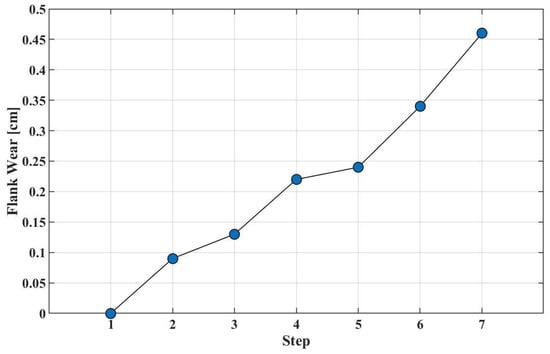 To apply the cosine similarity (CS) method, the acoustic emission signals were preprocessed and trimmed to stable, noise-free regions, ensuring coherent and undistorted results. With the processed signals, the CS calculation was performed, producing a similarity curve that reflected the wear measured with each pass of the tool over the workpiece. As tool deformation increased, the similarity curve decreased, indicating that the similarity between the worn tool and its initial, undamaged condition progressively diminished with each tool pass.
