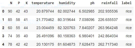 The dataset used in this study is an IOT sensor dataset available in Kaggle. The dataset includes soil nutrients measures like nitrogen (N), phosphorous (P), and potassium (K) and other parameters such as the pH of soil, moisture, and rainfall, with the type of recommended crop as the target variable, as shown in Figure 1. The Kaggle dataset has 2200 rows, and the class distribution of the dataset is shown in Figure 2.