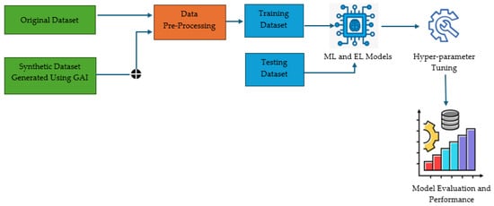These machine learning (ML) and ensemble learning (EL) models were evaluated on two types of datasets: the original dataset sourced from Kaggle and a concatenated dataset comprising both the Kaggle dataset and a synthetic dataset. The synthetic dataset was generated using the CTGAN generative AI technique. Pre-processing steps were applied to the datasets to normalize the values and convert categorical variables into numerical values, as illustrated in Figure 5. The datasets were then divided into training and testing datasets in the ratio 80% and 20%, respectively. The model was created using the training dataset and was tested using the testing dataset.