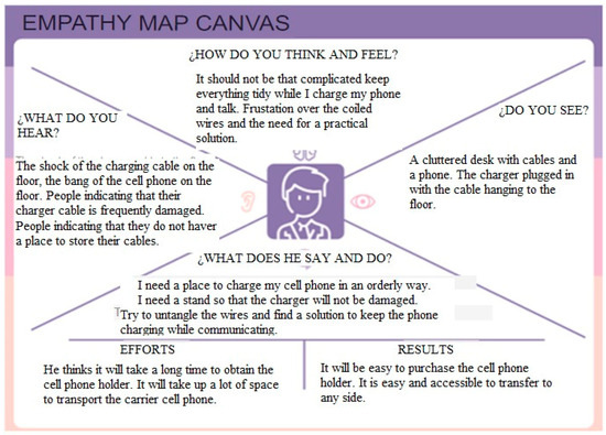 In this stage, tools such as an empathy map (Figure 1), hierarchical needs table and Customer Journey were used (Table 1). With the support of these tools, it was identified that cable management and the organization of mobile devices while charging represent a significant opportunity to improve the user experience and reduce costs associated with the constant acquisition of new cables.