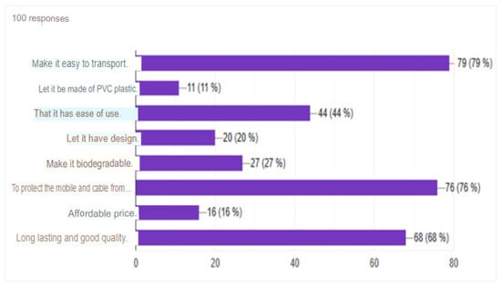 Of the 100 respondents, in terms of the characteristics that the wall cell phone holder should have, 79.00% would prefer it to be easy to transport, 76.00% would prefer it to protect their cell phone and cell phone cable, 68.00% would prefer it to be long-lasting and of good quality, 44.00% would prefer it to be easy to use, 27.00% would prefer that it be biodegradable, 20% would prefer it to have designs and 11.00% would prefer it to be made of PVC plastic (Figure 4).