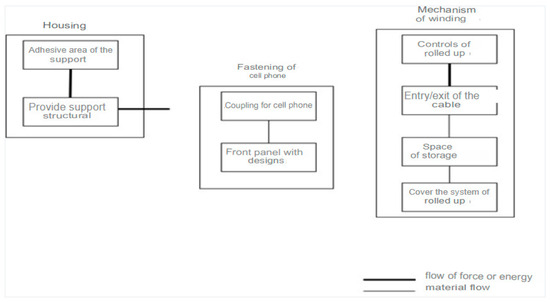 The functions “Coiling controls” and “Cover winding system” with the cell phone could be grouped and translated into a specific physical component: the “coiling mechanism”. This mechanism would be responsible for connecting the cable from the cell phone holder to the phone, the mobile transmitting of the electric current and ensuring that the cell phone charges correctly.
