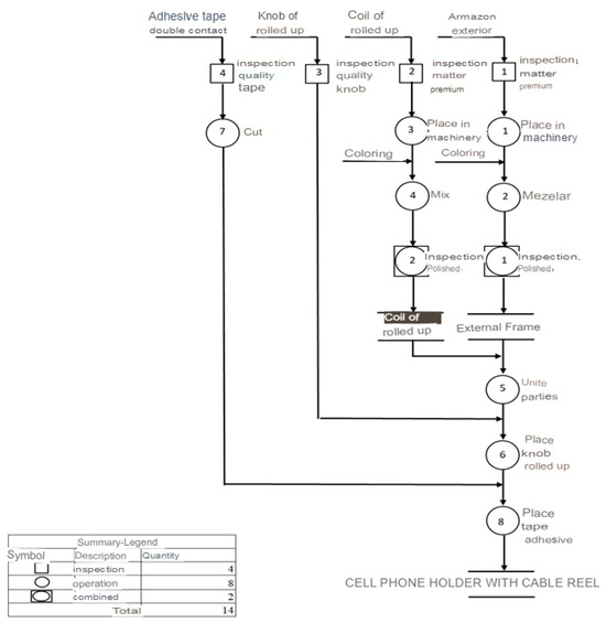 For the production process of the cell phone holder with cable winder, the main raw material is polyethylene plastic; it is a recyclable polymer, and the base color is white, which is why it is mixed with the colors of the design, namely blue for the holder and black for the knob and coil (Figure 6).
