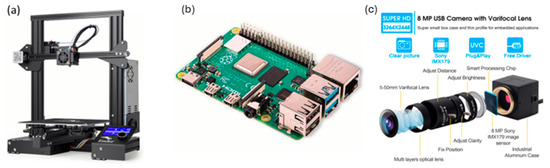 (a) Ender 3 3D printer machine; (b) Raspberry Pi 4 model B 4 GB RAM; (c) manually focused USB camera.
