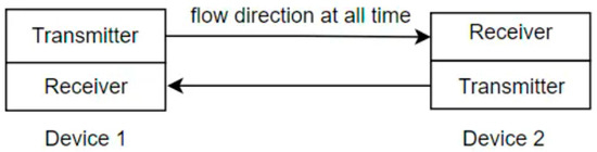 Serial communication is a method to send data one bit at a time in the form of binary pulses. The binary means that zero represents 0 volts or a logic LOW while one represents 5 volts or a logic HIGH. The full-duplex mode is a mode where both the transmitter and receiver can send and receive the data simultaneously (Figure 3). To put it simply, it is a simultaneous two-way communication method. The smartphone, or a phone unit, is an easy example that we can find [7].