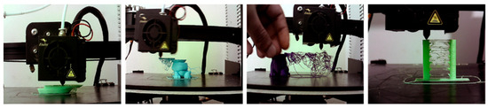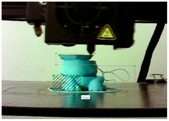 For the model training, various images of commonly known calibration pieces for 3D printers were used. These pieces contain the necessary features to validate that a printer does not produce specific failures. In the case of the present project, they were used to generate the failures that need to be detected. Taking advantage of the wide range of errors that can be generated by poor parameterization, the model was trained with additional errors such as layer shifting, detachment, and the detection of human interaction on the print bed (Figure 6).