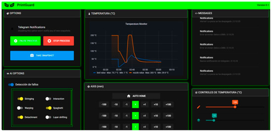 For the control system, the Python library PySerial was employed, which, when provided with the port and baud rate, automatically establishes the connection with the printer. Subsequently, using various programming techniques, the printer control logic was developed, enabling the management of temperatures, movement, and monitoring. A user interface was designed with VueJS, responsible for sending actions via MQTT from any computer to the device (Figure 8).