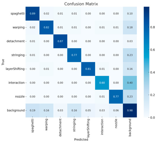 Through the conducted detection tests, an understanding of the model’s behavior and environmental characteristics was gained to ensure its optimal performance. Within the matrix in Figure 9, it can be observed that the model performs well in terms of error detection accuracy, particularly in the case of ”spaghetti”, where it demonstrated an 89% accuracy in detecting this error and only a 1% chance of misidentifying other types of errors, such as detachment, for instance. This was the only instance where the model showed a slight confusion with another error type. This can be explained by the fact that in 100% of cases where detachment occurs, spaghetti is also present due to the printing of the piece in mid-air. The spaghetti error was labeled under circumstances where detachment was always present, indicating that it does not represent a misclassification concerning the potential warnings that such detections may generate in the future.