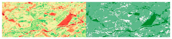 In the present study, the Sentinel-2 reflectance product was utilized to calculate both the NDVI and the NDWI. These calculations were performed by overlaying the necessary high-quality layers to obtain the desired image. The NDVI serves as an indicator that allows us to understand the amount of vegetation in an area. This indicator aids in monitoring crops, assessing droughts, predicting production, and identifying susceptible areas. Using data from the near-infrared (NIR) and red (RED) bands, as per Equation (1), we obtain an image depicting the state of the crops.