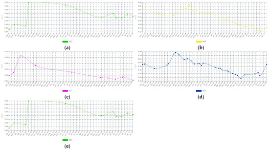 NDVI time series of the year 2019 (a), 2020 (b), 2021 (c), 2022 (d), 2023 (e). Obtained from the Landviewer webside, using the Landsat 8 time series analysis option.