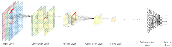 A convolutional neural network (CNN) is a highly effective deep learning algorithm in computer vision applications. Its main architecture includes a convolutional layer, a pooling layer, an output layer, and a fully connected layer (Figure 5). The convolutional layer, composed of convolutional filters, plays a crucial role in interacting with the input image to generate the output feature map. The addition of more convolutional layers allows for the capture of more specific patterns and features, giving the network greater learning and pattern discrimination capabilities, although this also makes it more complex and deeper.
