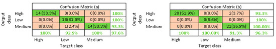 Evaluating the confusion matrices in greater detail, it is observed in matrix (a) of Figure 7 that in the training, an accuracy percentage of 97.6% was obtained, with a low-risk image being confused as a medium-risk image, and in matrix (b) of the same figure it is shown that in the validation, it was only wrong to distinguish two images of medium risk considering them as high risk, giving a total percentage of 96.3%.