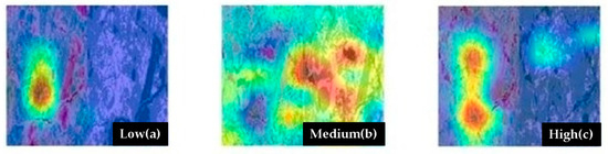 Selective results of Grad-CAM: (a) low-risk class, (b) medium-risk class, and (c) high-risk class.