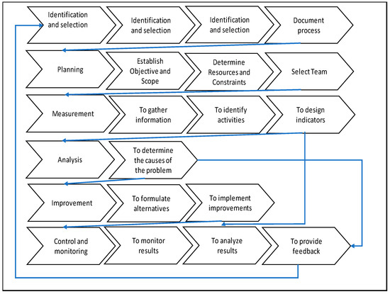 The Lean methodology is implemented through six phases: selection, planning, measurement, analysis, improvement, and control and monitoring. These stages are described by Meza et al. [17]. Below is Figure 1, which illustrates the phases, activities, and sequence of the Lean Logistics implementation.