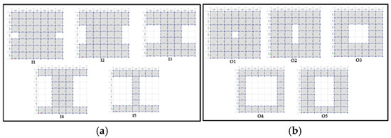 Examining the results shown in Table 6 and Table 7, it is observed that structures with diaphragm discontinuity irregularities (Type I and Type O) present translational behavior in all cases. According to the E.030 Standard [13], structures with openings greater than 50% present torsion; however, in the present case, it is observed that the structural behavior of irregular buildings is independent on the percentage of the opening.