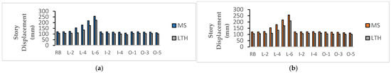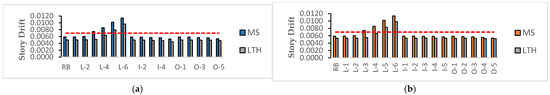 Story drifts are important to evaluate, as are lateral displacements, because without proper control they can directly affect the main structural elements and adjacent buildings. Figure 5a,b represent the maximum story drifts, which occur on floor three (03) for all the structures under analysis. It is observed that the values of story drifts for structures L-3, L-4, L-5, and L-6 exceed the permissible value of 0.007 indicated in Standard E.030 [13] for both the X and Y direction.