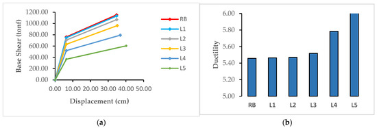 On the other hand, Figure 8b represents the ductility of the L-type structures obtained as the ratio of the ultimate displacement to the yield displacement. Analyzing Figure 8b, it is observed that the irregularity in plan and the ductility are directly proportional. For the L-5 structure, the ductility increases by 15.58% with respect to the regular structure.