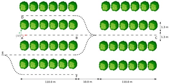 For each sequence, the robot was manually teleoperated starting from the map reference frame, {M}, to emulate navigation patterns that are pertinent to tasks in precision agriculture. The specific trajectories were as follows: (AB) a straight 110 m path along the inter-row space of blueberry crops, (AC) a 230 m linear route starting at the inter-row space, traversing a transit zone between crop blocks, and continuing for another 110 m to the end of a second crop row, (AD) a U-shaped trajectory encompassing sequence AB and the adjacent inter-row space, and (AF) an S-shaped path covering three adjacent inter-row spaces. Figure 1 provides a bird’s eye view of these trajectories within the farm setting. Both farm personnel and in situ measurements contributed to this diagram.