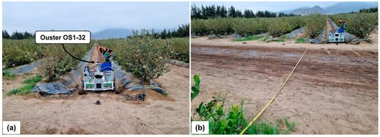 Figure 2 provides a visual representation of the robot’s navigation within the blueberry farm, illustrating the environmental conditions pertinent to the data collection process. Specifically, Figure 2a presents the robot at the onset of its trajectory, corresponding to sequence AB, where the robot’s pose predominantly varies in the x-axis, with minimal deviations in the y-axis. Conversely, Figure 2b captures the robot as it transitions into a different crop block, traversing the transit zone described in sequence AC. This zone is marked and measured using a measuring tape.