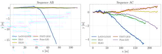 It can be noted that in sequence AC, DLIO, FAST-LIO2, and Point-LIO show consistency with each other regarding the path length, although they start to separate from each other as distance increases. DLO’s estimation resembles that of Point-LIO but is unable to complete the route. LeGO-LOAM exhibits the most significant divergence from the intended path early on and continues this trend throughout the sequence. This may reflect limitations in the algorithm’s ability to handle the challenges in the present context, such as feature-poor areas within the crops for feature matching, only managing to get past 175 m due to the presence of windbreak nets at the middle and end regions of the sequence.