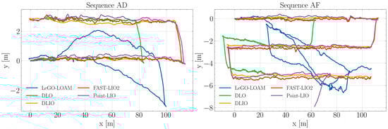 In Figure 4, sequence AD shows that the DLIO, FAST-LIO2, and Point-LIO algorithms exhibit a high degree of overlap, indicating similar performance in trajectory estimation. These paths closely adhere to the intended sideways U-shaped path, reflecting robustness in these algorithms’ ability to handle the environmental conditions during this experiment. The DLO algorithm while in alignment with the aforementioned three, incorrectly estimates the horizontal displacement of the robot, stopping at around 83 m for the first linear section. Conversely, LeGO-LOAM maintains a linear path until the 40 m mark, where it starts failing to compute the ego-motion of the platform. Nonetheless, when approaching the end of the first linear section, it managed to retrieve features from the windbreak net dividing the blueberry crop blocks, which allowed it to closely estimate the turn to the left and the beginning of the returning path.