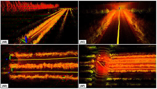 Table 2 summarizes the results for the translational error. From the data, it can be noted that DLIO achieved a superior performance across all test sequences. With translational errors of 0.142 m, 0.126 m, 0.548 m, and 3.129 m in sequences AB, AC, AD, and AF, respectively. DLIO demonstrates a consistently high level of accuracy. In contrast, LeGO-LOAM, an LO algorithm, shows a marked discrepancy in performance. Notably, in sequences AD and AF, the lower translational errors (2.655 m and 3.141 m, respectively) are misleading. The asterisks indicating sub-optimal paths reveal significant divergence from the intended trajectories. This consistent under-performance across varied sequences highlights inherent limitations in LeGO-LOAM’s approach to LiDAR-based odometry for agricultural settings.