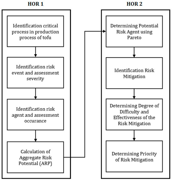 This study employed a combination of observational data collection, in-depth interviews, and focus group discussions to identify and analyze the risks and processes involved in tofu production at MD Tofu Factory. Data were collected from three expert respondents—the director, head of production, and a production operator—who were selected due to their comprehensive knowledge of the tofu production process. The study utilized the HOR framework as a risk assessment tool to determine and prioritize actions for risk mitigation. The HOR framework is comprised of two main stages, HOR 1 and HOR 2, as shown in
