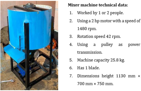 Utilizing new and renewable energy sources, particularly coconut shell charcoal briquettes, represents a crucial solution in addressing the limitations of fossil energy sources and combating climate change. The objective of this study is to design, fabricate, and test a mixing machine tailored to the requirements of micro-, small-, and medium-sized enterprises (MSMEs) in the briquette industry. The target is a minimum output of 100 kg per hour, meeting the quality standards outlined in SNI NO. 01/6235/2000. The composition used consisted of 100% charcoal, 4% adhesive flour, and 25% water. Various testing durations—4 min, 8 min, and 12 min—were employed. Optimal mixing of these components was achieved using a machine measuring 1130 × 750 × 700 mm, rotating at 44.4 rpm, and powered by a 2HP motor. The most effective mixing duration was found to be 12 min, resulting in a total mixed mass of 25.8 kg.