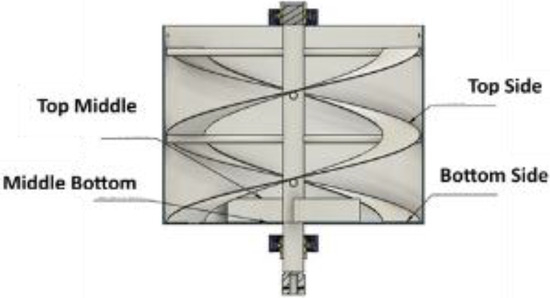 Upon completion of the mixing process, the machine was turned off, and the container was opened. The lever at the bottom of the container was pulled to release the mixture. Subsequently, samples were taken from various positions around the stirrer, including the side, the middle at the top, and the bottom of the stirrer, to assess the uniformity of the stirring process. Figure 4 shows the sampling positions.