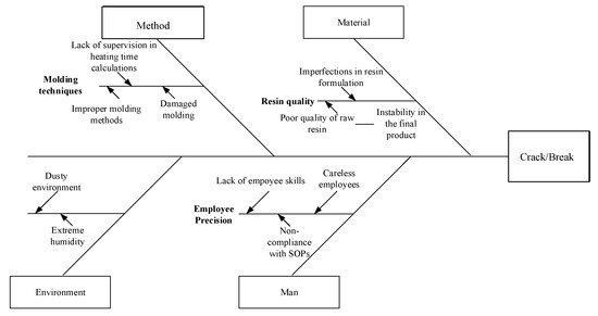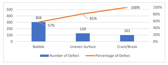 Based on the calculations of the percentages of defects, as shown in Figure 6, the Pareto diagram reveals that the most significant defect type was bubbling, accounting for 57%, while the least significant was cracking or breaking, at 19%. According to the 80/20 principle, improvements should focus on addressing the defects caused by bubbling and uneven surfaces, as these contribute most significantly to the overall defect rate.