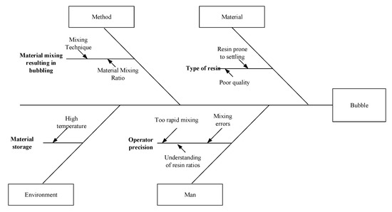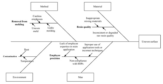 Based on the FMEA calculations, the RPN (Risk Priority Number) results for each type of defect were as follows: For bubbling defects, the highest-ranking issue was resin mixing errors, with an RPN of 280. This is due to employees’ lack of focus and insufficient skills in resin mixing, leading to improper mixing and the formation of air bubbles. For uneven surface defects, the highest-ranking issue was manual production processes, with an RPN of 336. This resulted from high consumer demands and production targets, causing inconsistencies in the resin surface layer. For cracking defects, the highest-ranking issue was a dusty environment, with an RPN of 245, leading to employee discomfort and headaches. Based on the identification of defects and their contributing factors, the highest-ranking issues were prioritized for corrective actions to minimize failure causes.