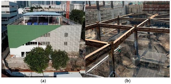 (a) Front view of the construction process of military hospital; (b) underground structure construction of military hospital using top-down method.