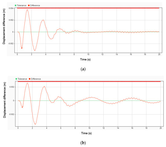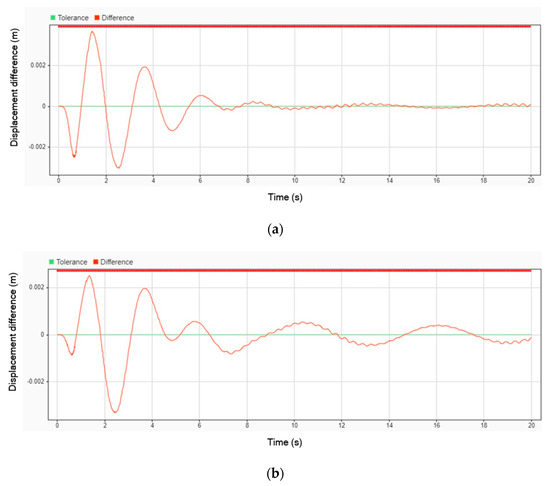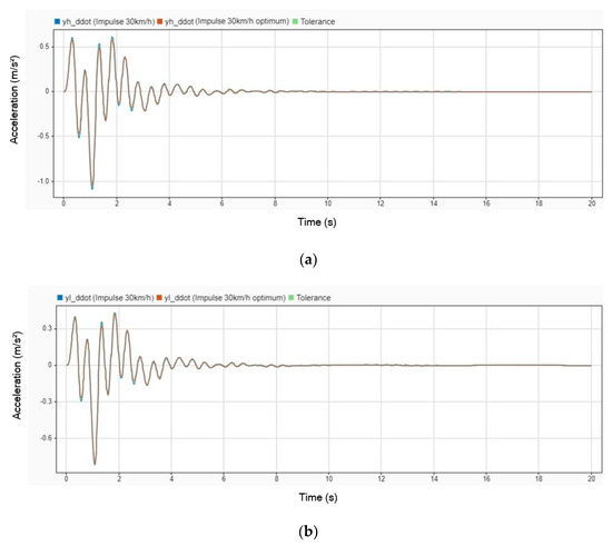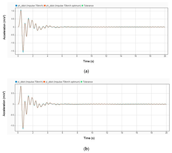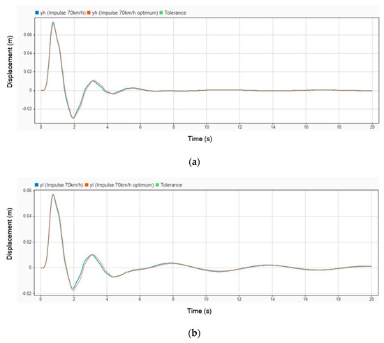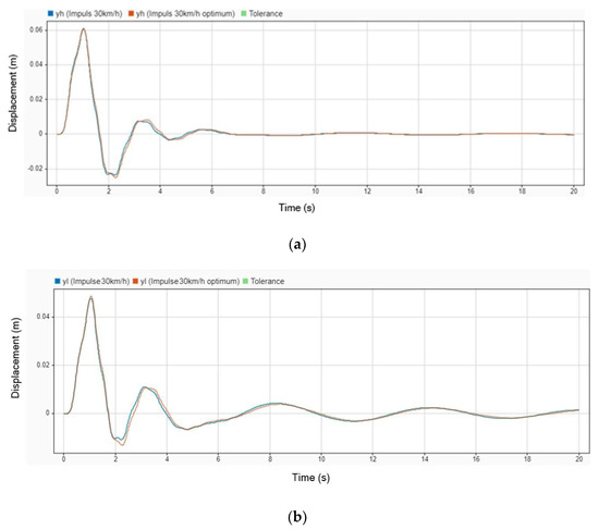 The next simulation was conducted with an impulse input from the road while the vehicle was traveling at a velocity of 70 km/h. Figure 12 illustrates the displacement comparison between using a DVA and not using one. In the graph, the blue line represents the displacement when the stretcher operates without a DVA installed, while the orange line represents the displacement when the DVA is installed. This comparison highlights the impact of the DVA in reducing displacement and enhancing the stability of the stretcher under dynamic road conditions.