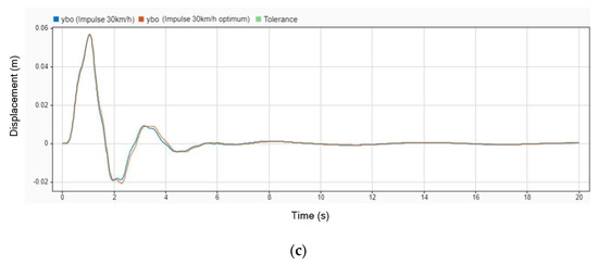 Displacement graph comparison without DVA and with DVA at 30 km/h on (a) head; (b) legs; (c) body.