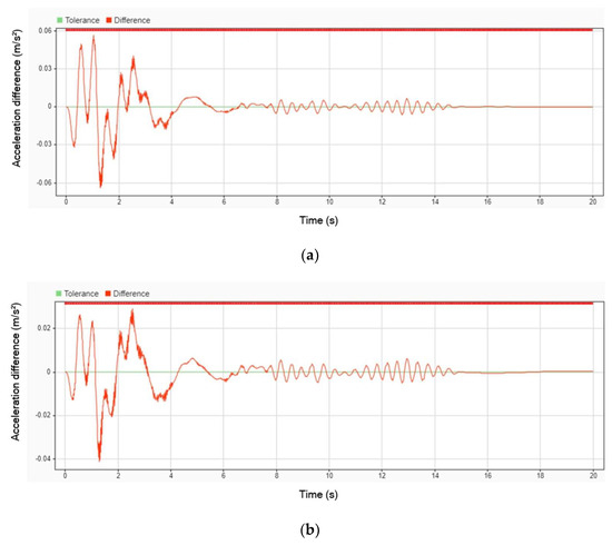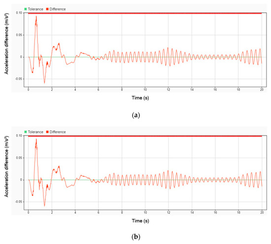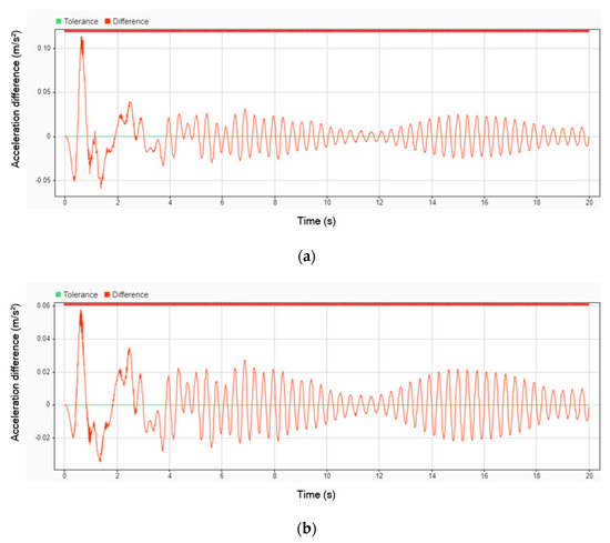 Figure 15 illustrates the difference in acceleration between using a DVA and not using one. The results indicate that the peak amplitude of acceleration decreased by 9.09% for the head, 6.62% for the legs, and 9.01% for the body when the DVA was employed. Despite these reductions, all parts of the patient’s body continued to oscillate throughout the entire simulation, with vibrations persisting even after 20 s. This suggests that while the DVA effectively reduces peak acceleration, it does not completely eliminate sustained oscillations over time.