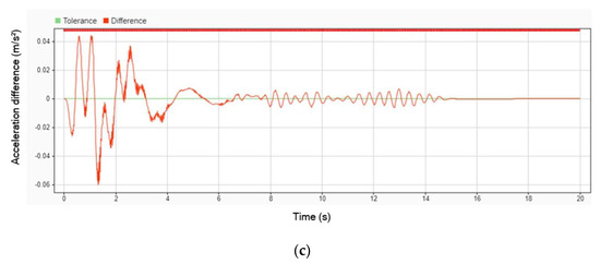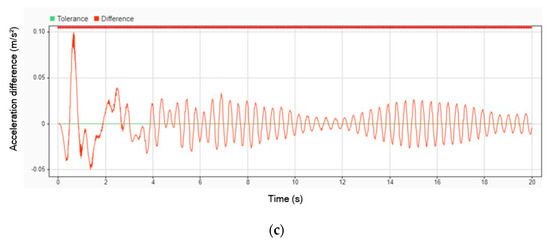 Acceleration difference without DVA and with DVA at 50 km/h on (a) head; (b) legs; (c) body.