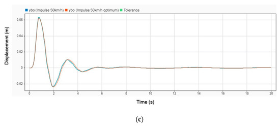 Displacement graph comparison without DVA and with DVA at 50 km/h on (a) head; (b) legs; (c) body.