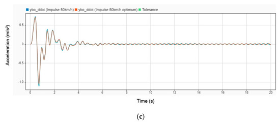 Acceleration graph comparison without DVA and with DVA at 50 km/h on (a) head; (b) legs; (c) body.