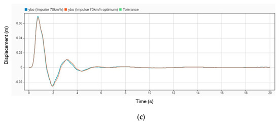 Displacement graph comparison without DVA and with DVA at 70 km/h on (a) head; (b) legs; (c) body.