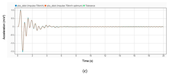 Acceleration difference without DVA and with DVA at 70 km/h on (a) head; (b) legs; (c) body.