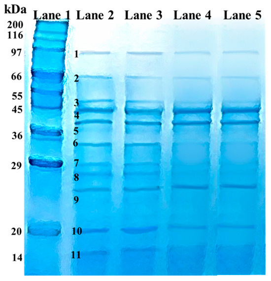 - Bollag, D.M.; Roszyaki, M.D.; Edelstein, S.J. Gel electrophoresis under denaturing conditions. In Protein Methods, 2nd ed.; Wiley-Liss: New York, NY, USA, 1996; pp. 107–120. [Google Scholar]