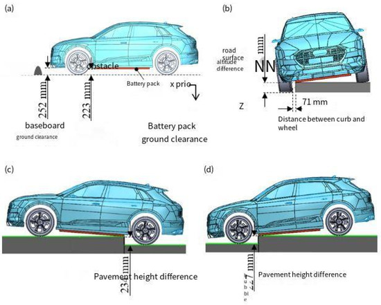 Safety features in electric vehicles (EVs) [50] (a) normal position; (b) the vertical height of the obstacle is higher than the ground clearance of the battery pack; (c) the vehicle passes the curb; and (d) the wheel on one side falls into the curb with a height difference.