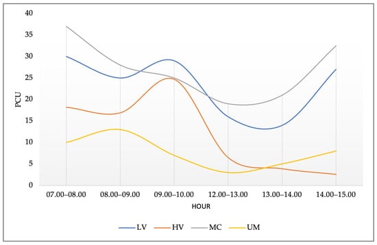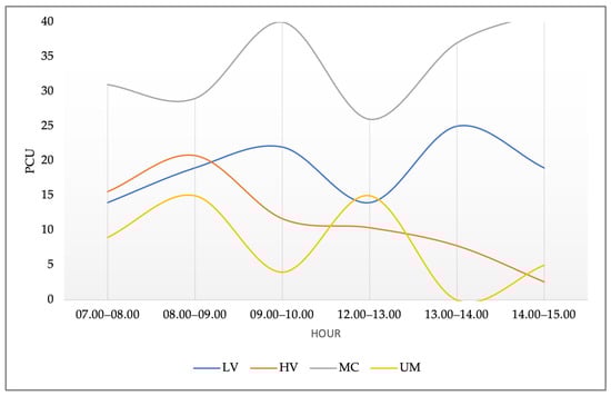 ADT describes the volume of traffic passing through a particular point or line on a road cross-section. ADT data in this study are needed for the road’s planning, design, and operational management phases. ADT shows the number of vehicles passing through an observation point in a unit of time (day, hour, minute, second). In connection with the determination of the ADT class, the unit of the number of vehicles used is the Passenger Car Unit (PCU). The survey results conducted in June 2024 can be seen in Figure 2 and Figure 3.