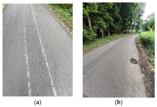 Distress dominance of rural roads. (a) Road cracks due to repeated traffic and pavement conditions. (b) Potholes due to neglect of early distress.
