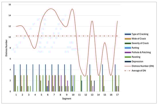 Interpretation and prediction of data are essential parts of a road pavement management system. Large data groups only become meaningful if interpretation and predictions are carried out correctly and accurately. Various attributes in a road pavement management system must receive balanced attention. All problems and objectives should be addressed and resolved comprehensively continuously. Various road conditions were obtained based on the results of a 1700 m survey divided into 17 segments. Each segment had different characteristics but had almost the exact cause of damage. Using the 1990 Bina Marga damage assessment method, the average road condition was 10.2. The recapitulation of the distress number can be seen in Figure 5. Based on Table 3, the road condition value means a distress number of 4.