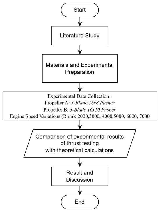 This research was conducted by conducting thrust test experiments with the ground test method on propeller A and propeller B types. The experiment was performed on a ground test bed at engine speed variations of 2000, 3000, 4000, 5000, 6000, 7000 (Rpm). This investigation utilizes a ground testing approach and theoretical calculations to examine and improve propeller performance. Ground testing offers precise measurements of thrust force in a monitored setting, whereas theoretical calculations predict thrust through mathematical models. In general, the research flow diagram is depicted in Figure 1 below: