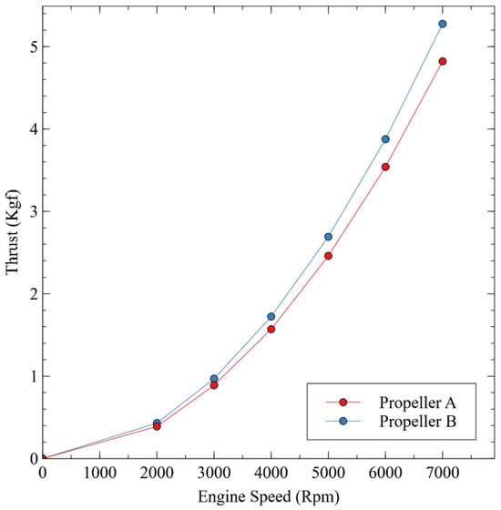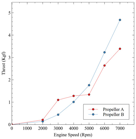 Experimental Thrust Comparison on Three-Blade Propeller 16 × 8 (Propeller A) and Three-Blade Propeller 16 × 10 (Propeller B).